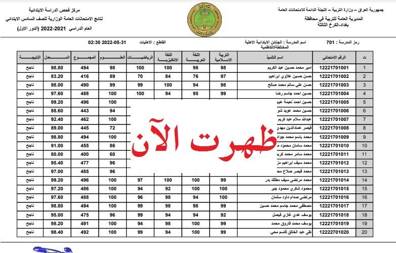 نتائج السادس الابتدائي 2024 الدور الاول لجميع محافظات العراق وزارة التربية العراقية Mlazemna